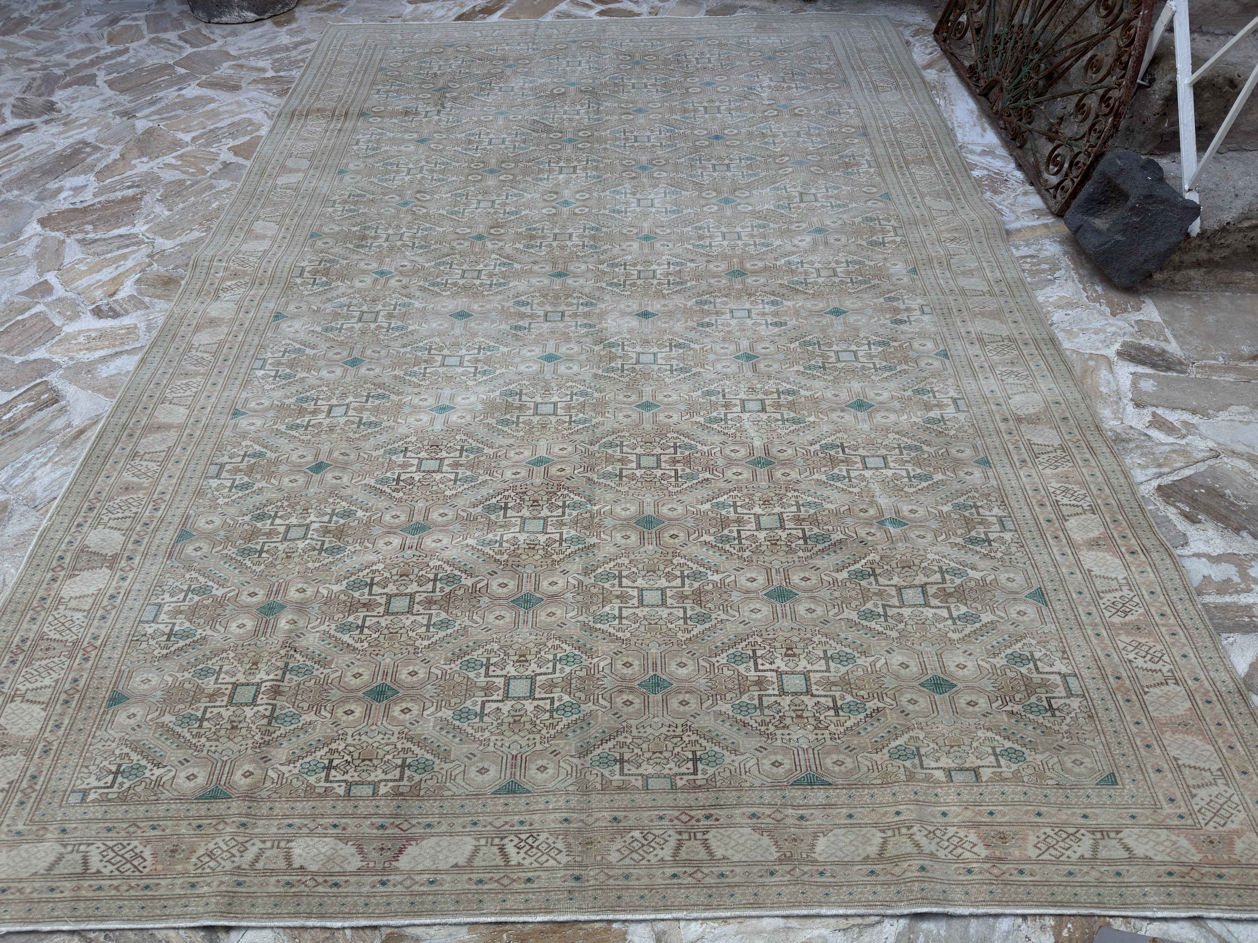Rugs, with their designs, materials, and colors determined by skilled weavers, are crafted using the hand-knotting technique on a vertical loom. Each rug has its unique knotting technique. Completing a single rug can take months or even years. The rugs are professionally cleaned; age-related wear and natural inconsistencies are inherent to these unique handmade Turkish rugs. Passed down from generation to generation, these rugs are now just a click away.