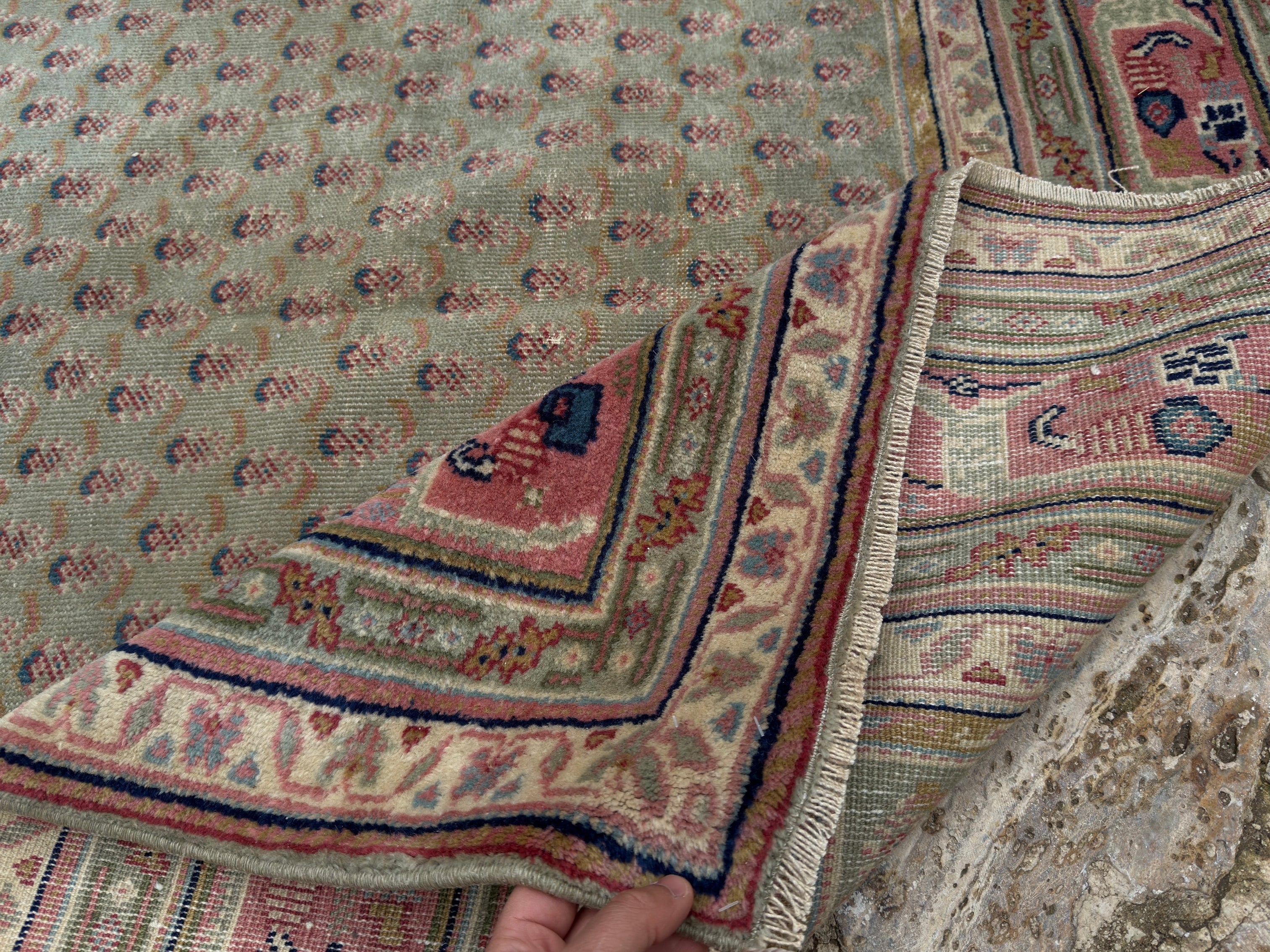 The unique stamp of their previous life is still present in green vintage rugs; their imperfections, soft fading, and faint worn patterns all add to their allure. These heirloom items were made on traditional looms using time-honored weaving processes, in contrast to mass-produced modern rugs. Botanical pigments, such as madder root, indigo leaves, and walnut shells, were used to dye wool fibers, producing a variety of subtle green hues that changed over time. As a result, there is a tactile depth that is both visible and palpable: low pile sections provide underfoot comfort, and faded highlights produce organic tone differences. A marker of authenticity that is impossible to duplicate in newly made designs, each rug has a fingerprint of its maker and its journey.