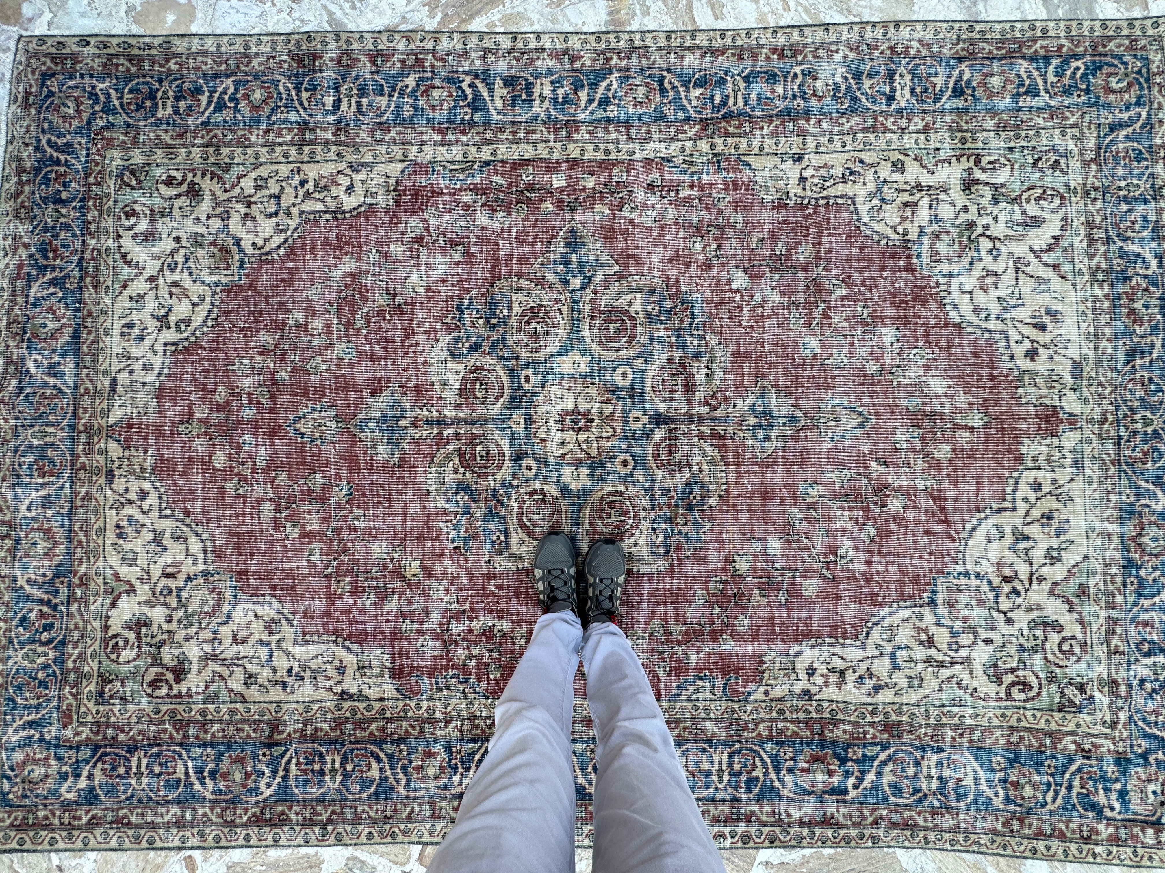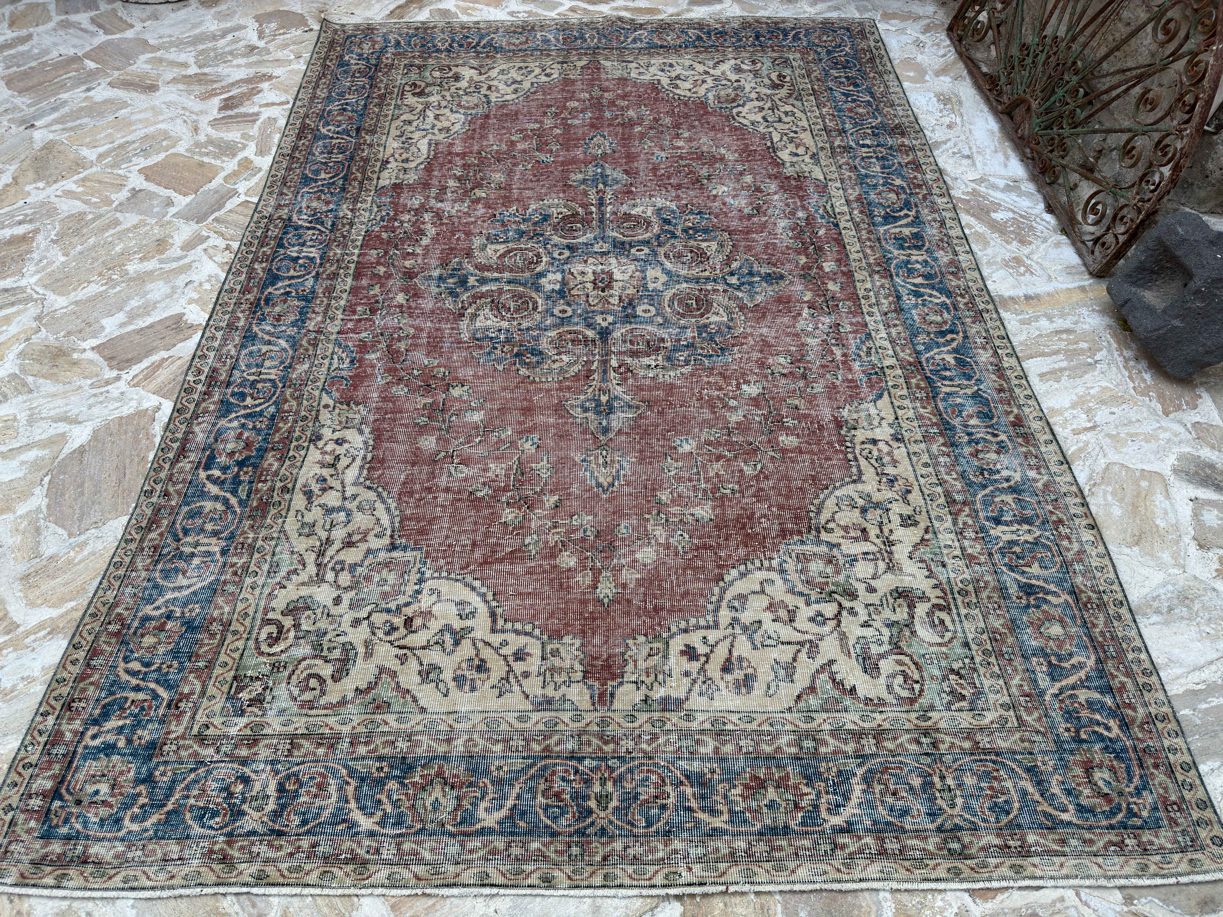 Rugs, with their designs, materials, and colors determined by skilled weavers, are crafted using the hand-knotting technique on a vertical loom. Each rug has its unique knotting technique. Completing a single rug can take months or even years. The rugs are professionally cleaned; age-related wear and natural inconsistencies are inherent to these unique handmade Turkish rugs. Passed down from generation to generation, these rugs are now just a click away.