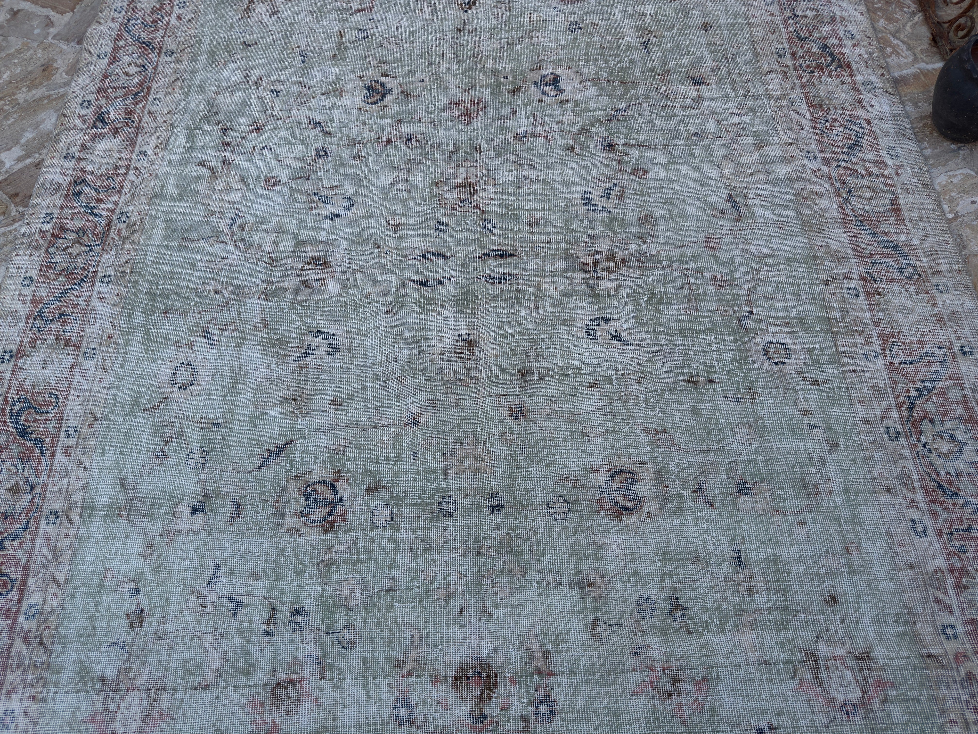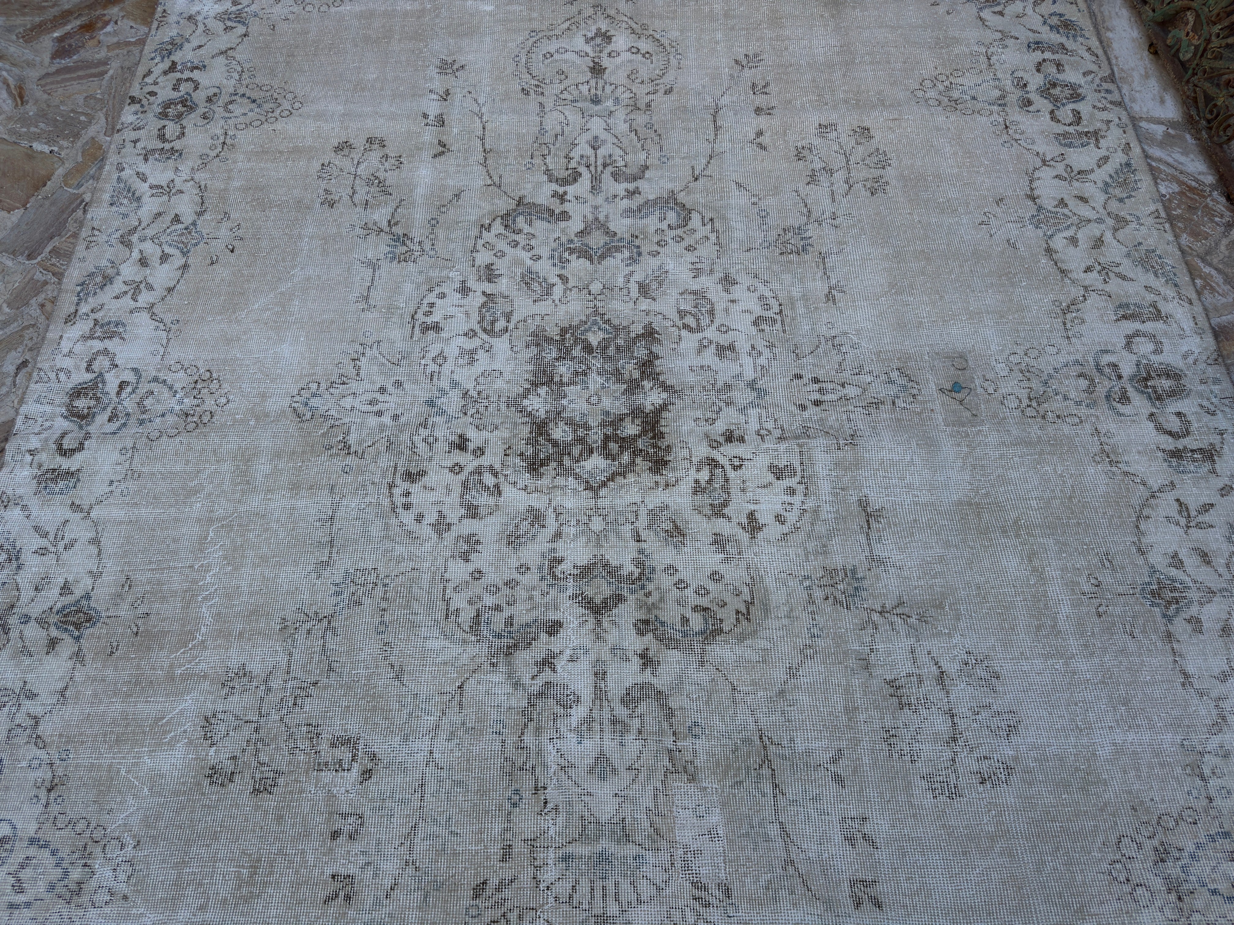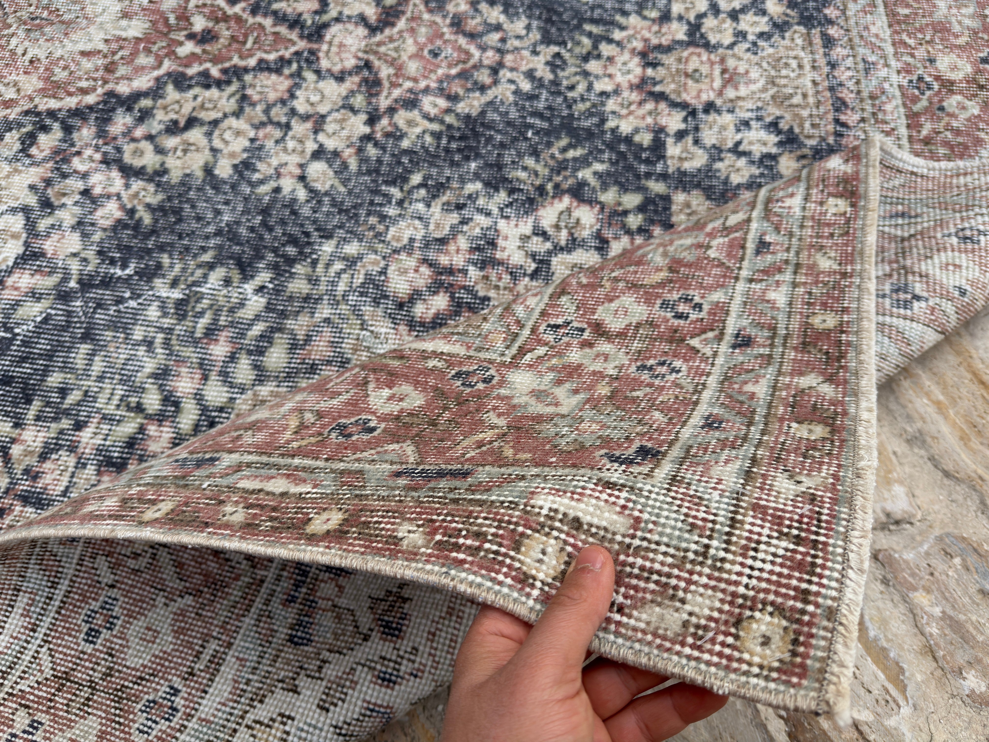 This is hard because there are both real and fake rugs on the market. People have sent me pictures of rugs and asked, "Is this a real vintage Turkish rug?" My answer usually starts with "Turn it over." The back of a rug tells you a lot. Real vintage Turkish rugs reveal the knots, uneven spacing, and little flaws that people make. Rugs manufactured by machines look excessively crisp and clean. Another sign? The stuff. Turkish wool rugs are soft but strong, not like plastic. You will know if you run your hand over one.
