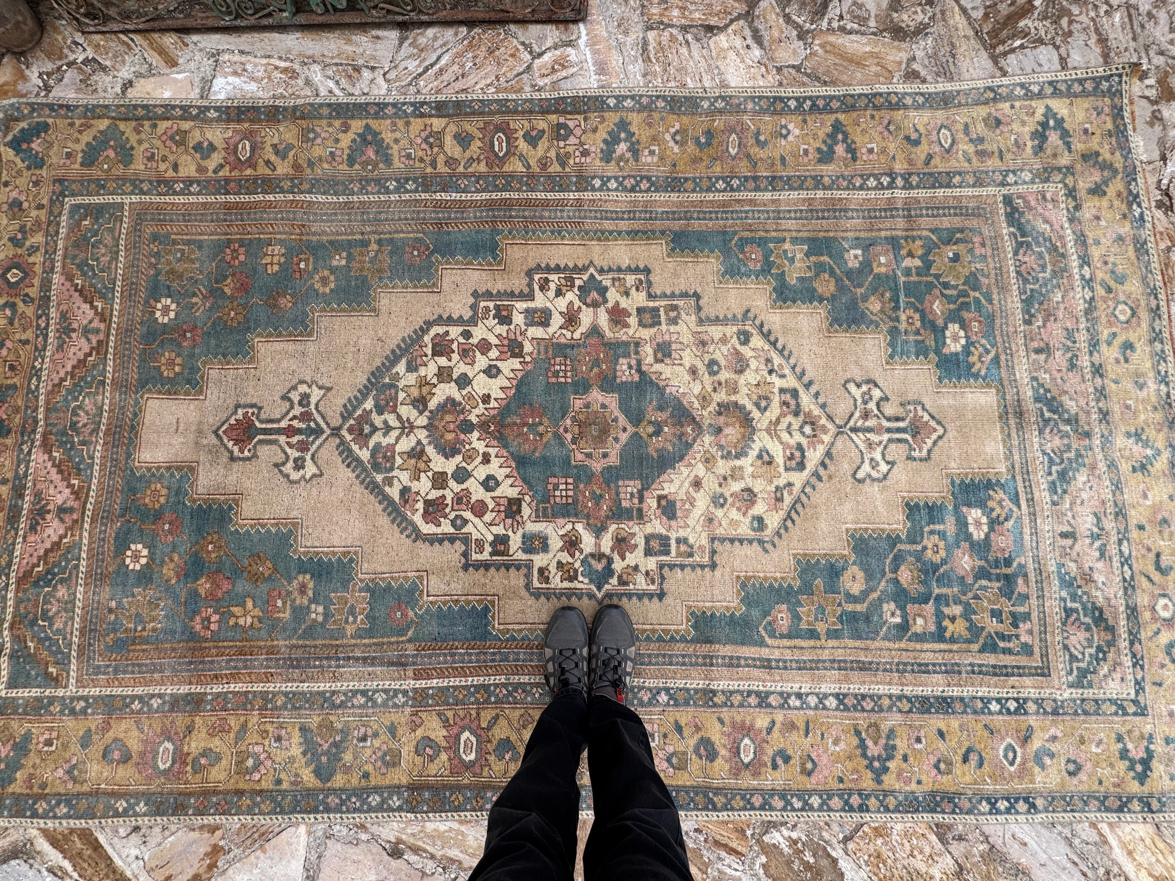 Rug has been professionally cleaned; age-related wear and natural inconsistencies are inherent in these unique, handcrafted vintage rugs.