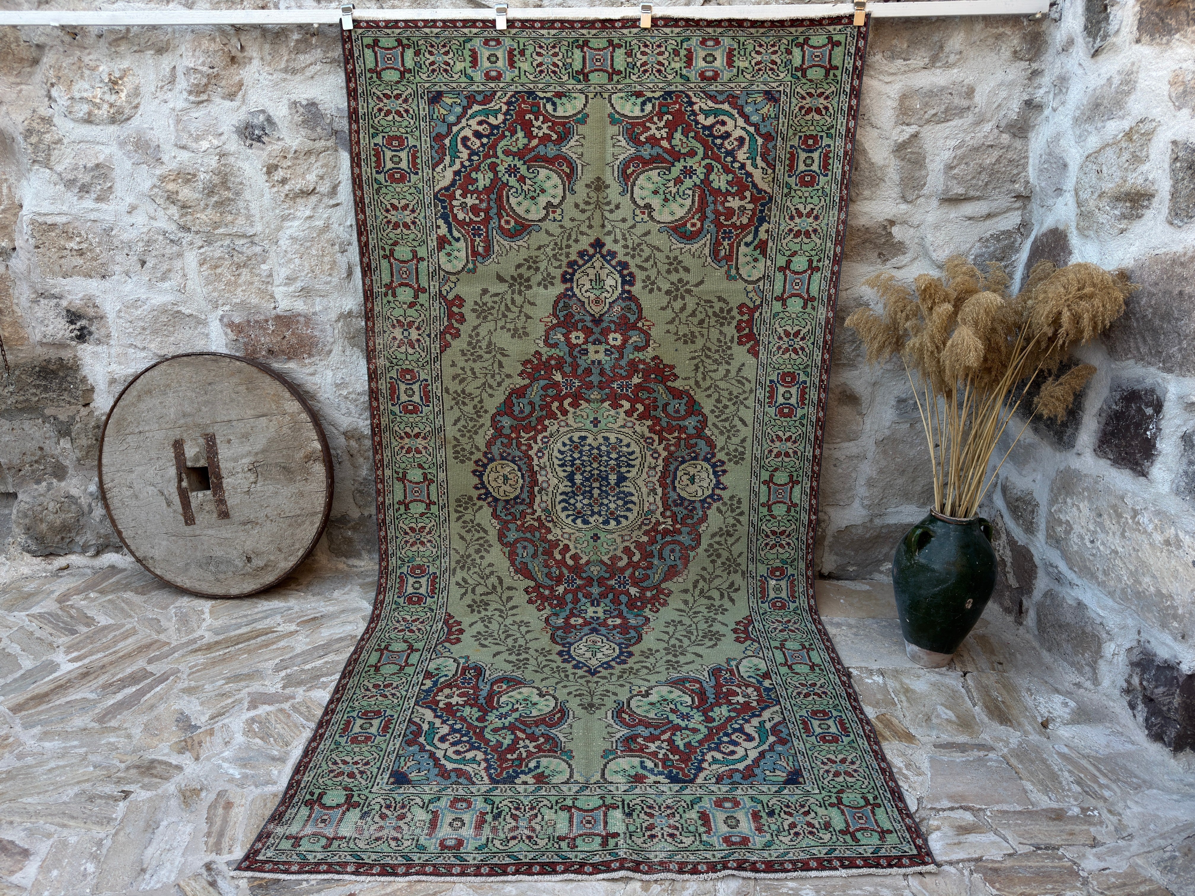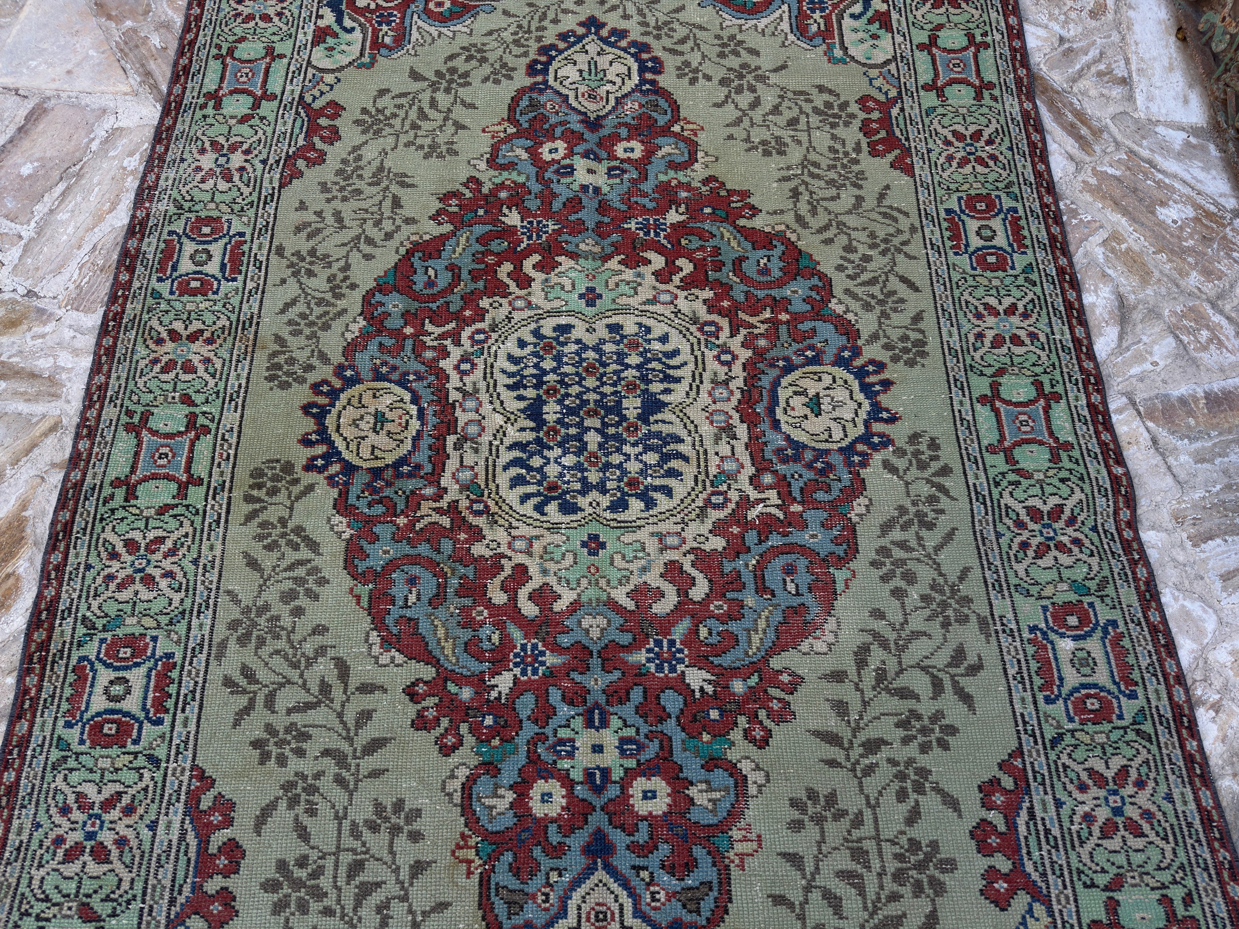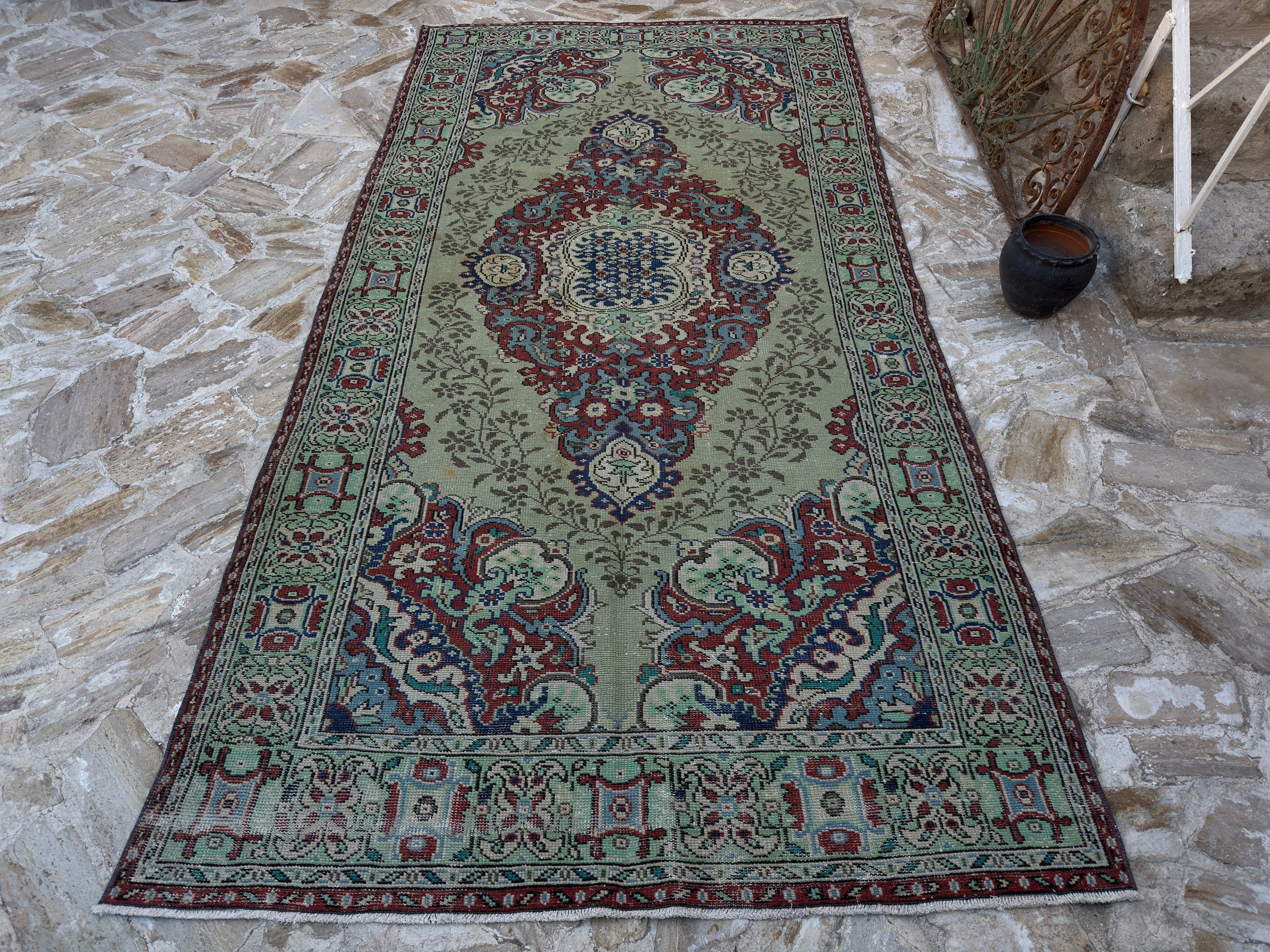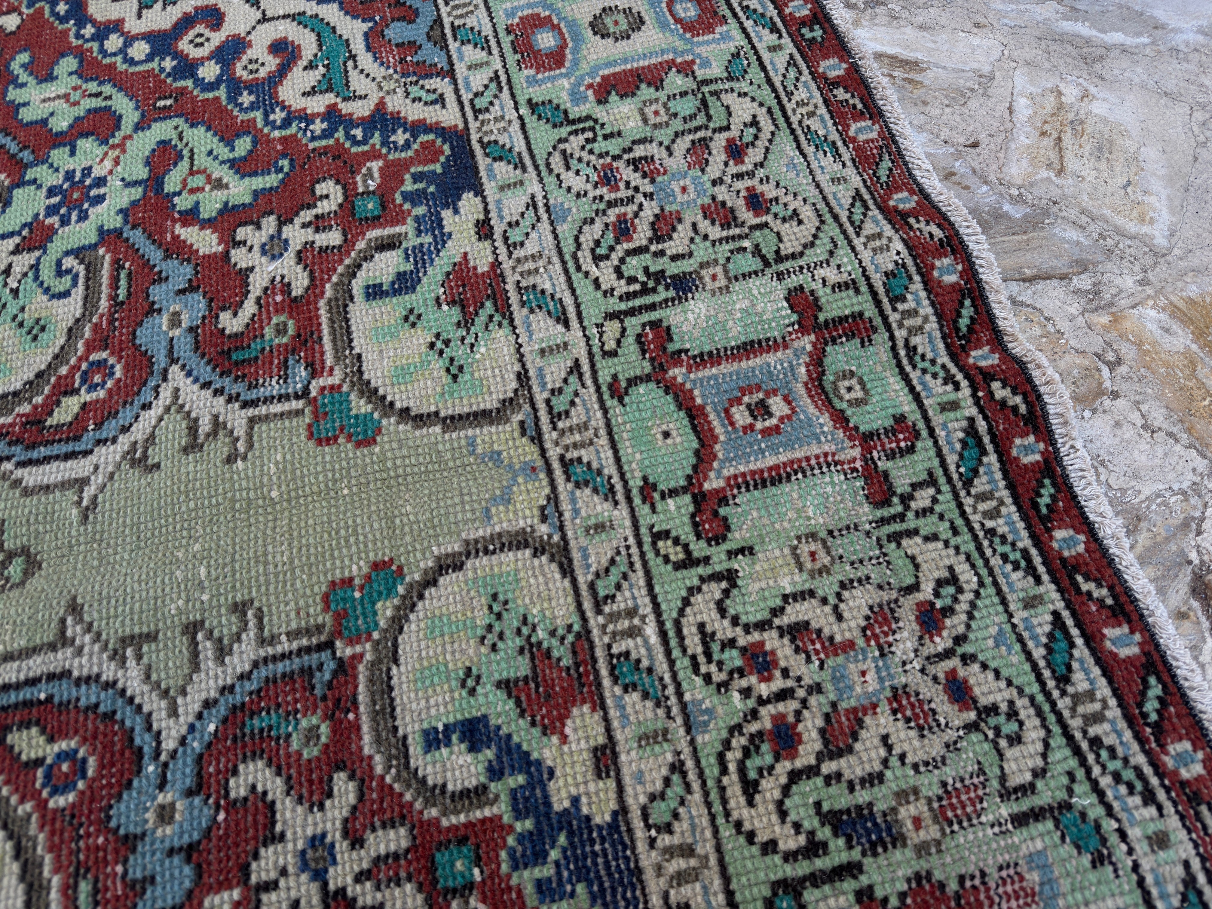 Rug has been professionally cleaned; age-related wear and natural inconsistencies are inherent in these unique, handcrafted vintage rugs.