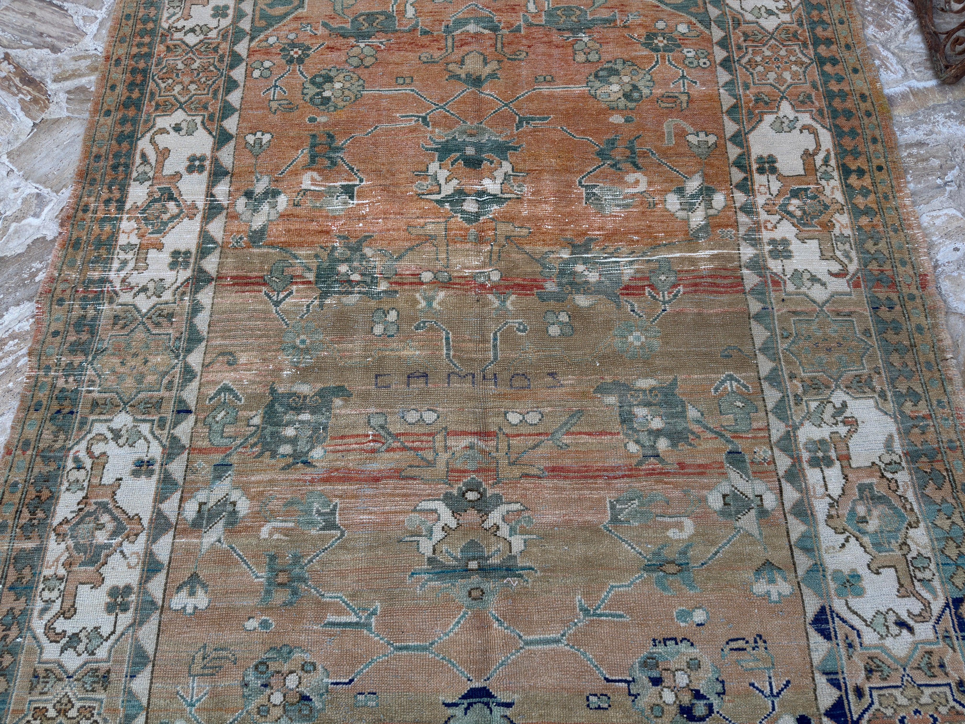 Rug has been professionally cleaned; age-related wear and natural inconsistencies are inherent in these unique, handcrafted vintage rugs.