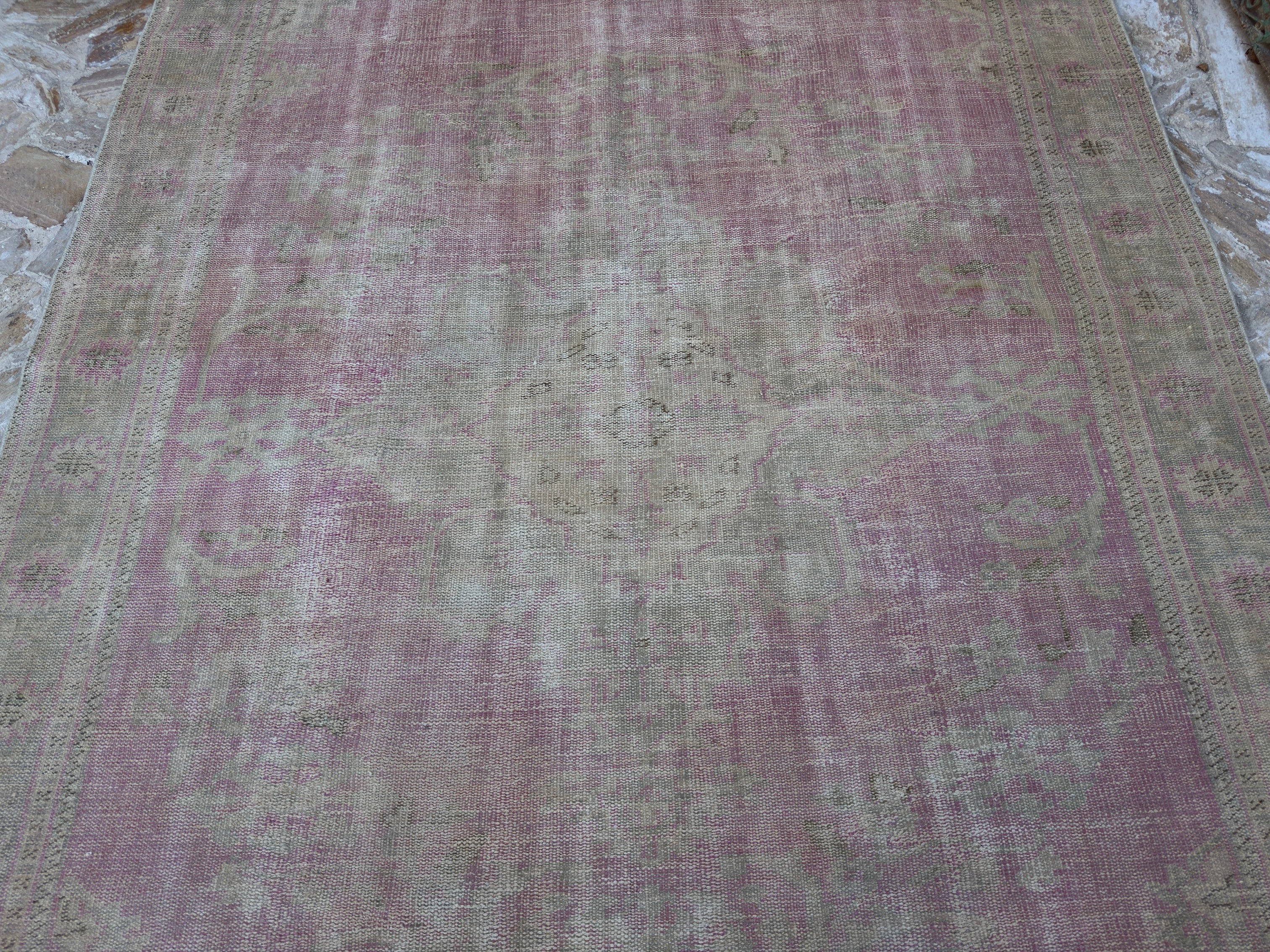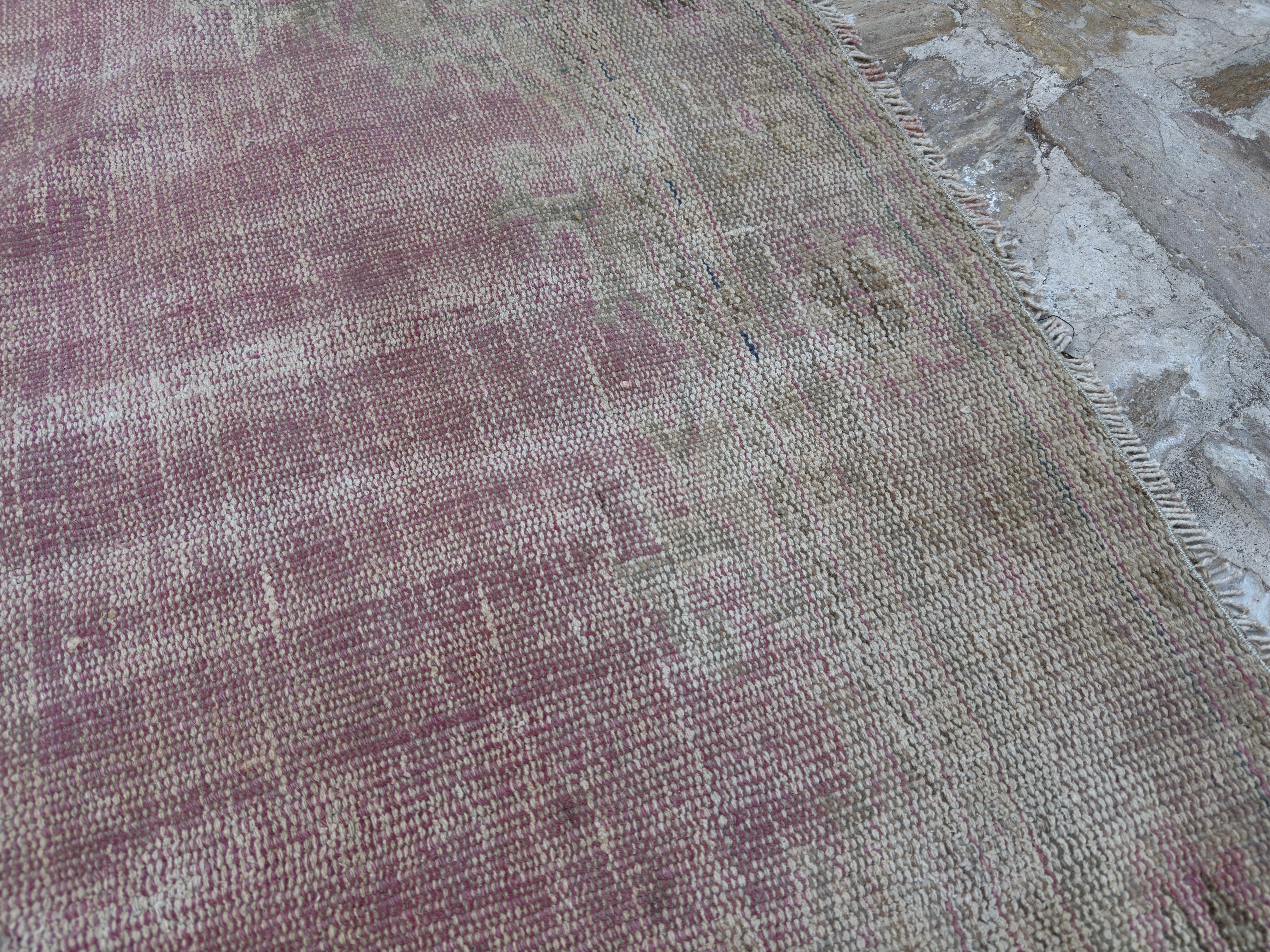 Rug has been professionally cleaned; age-related wear and natural inconsistencies are inherent in these unique, handcrafted vintage rugs.