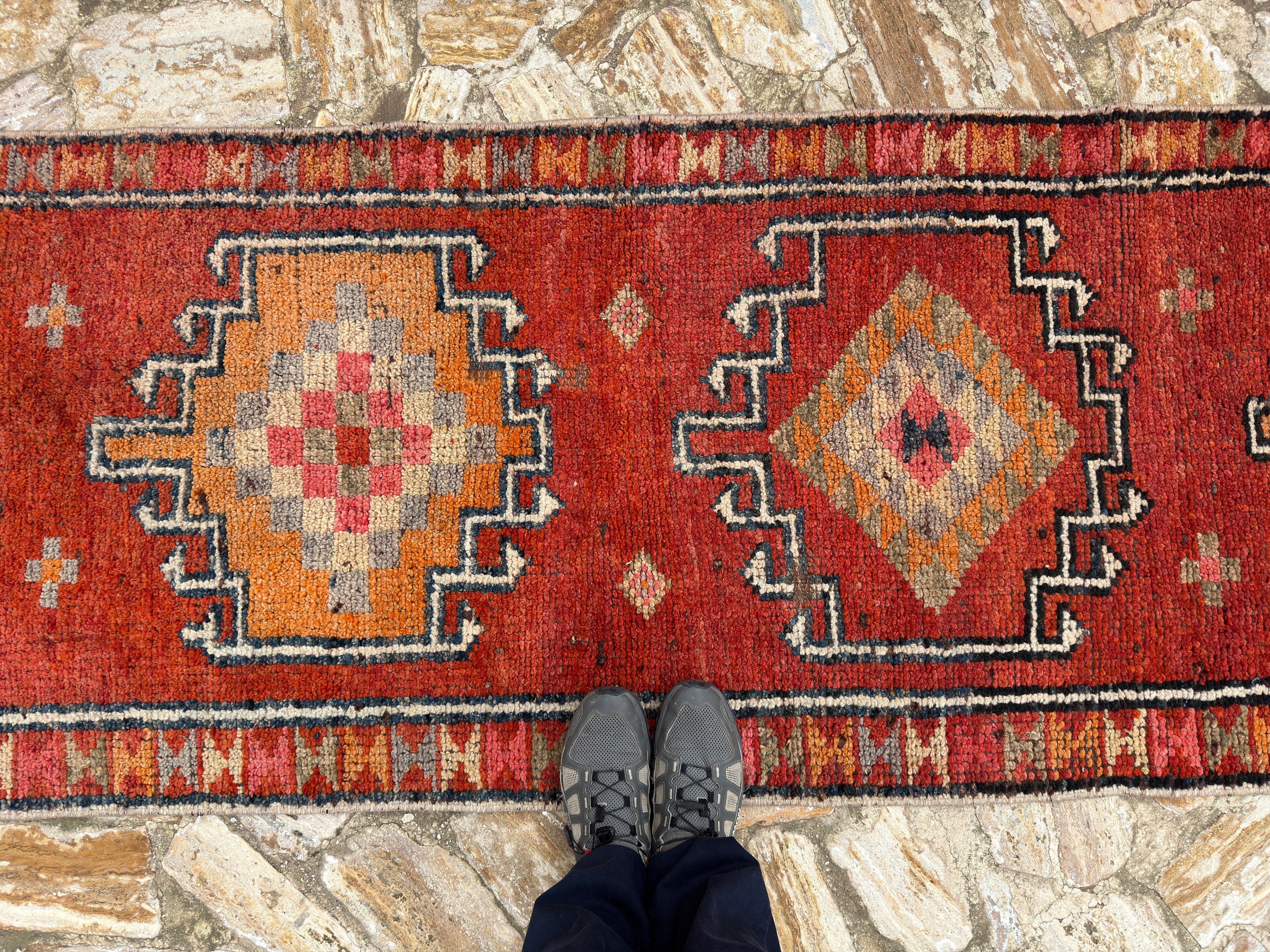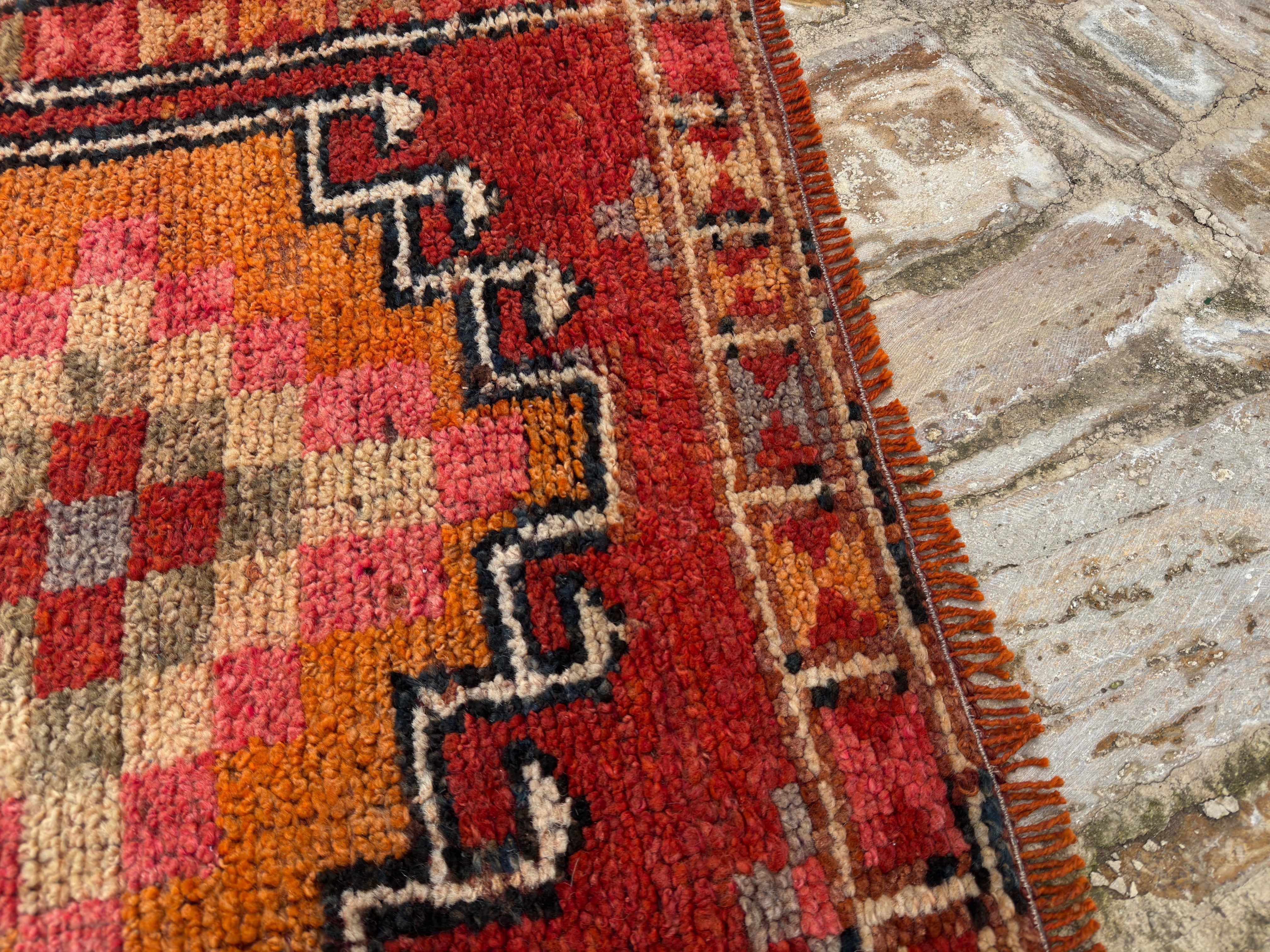 Rug has been professionally cleaned; age-related wear and natural inconsistencies are inherent in these unique, handcrafted vintage rugs.